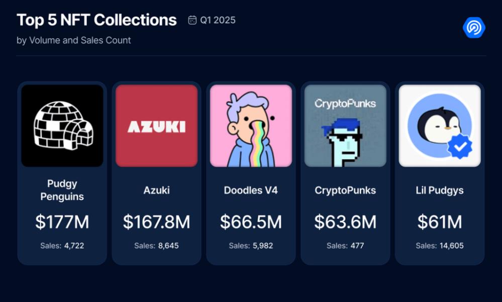 Среди коллекций по итогам квартала в лидерах оказались: Pudgy Penguins, Azuki, Doodles, CryptoPunks и Lil Pudgy.